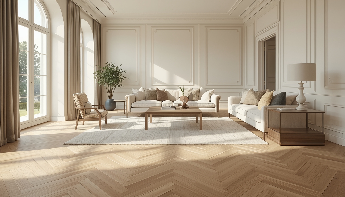 In klassischen Interieurs wirkt französisches Fischgrät besonders harmonisch. Helle bis mittlere Eichentöne unterstreichen die elegante Wirkung des Musters und passen hervorragend zu hochwertigen Stoffen, ruhigen Farbwelten und Möbeln mit feiner Linienführung.