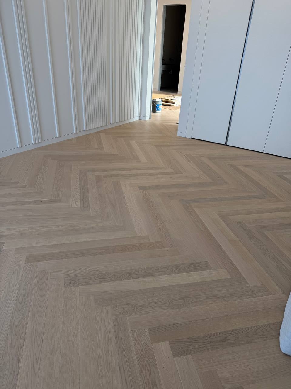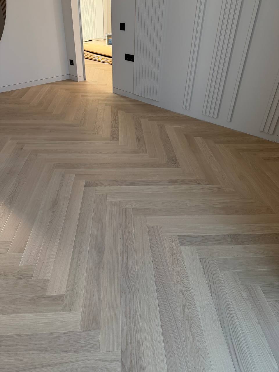 In diesem Projekt wurde Scheucher Parkett im Fischgrät-Design „Bilaflor Natur Bianca F4“ verlegt. Das Ergebnis: ein heller, eleganter Boden mit klarer Struktur und hochwertiger Ausführung – raumübergreifend verlegt und ohne Übergangsleisten für ein durchgängiges, harmonisches Gesamtbild.